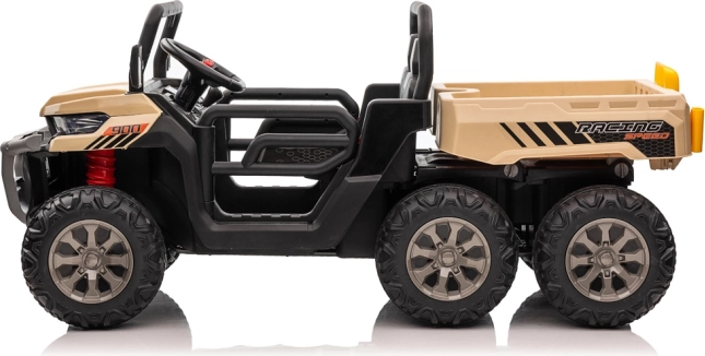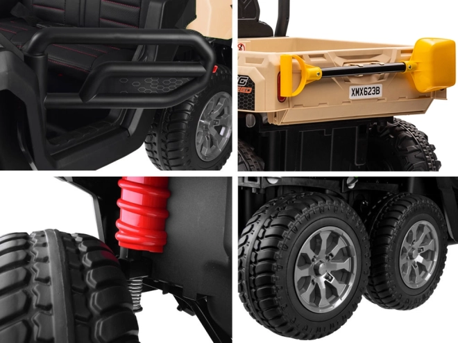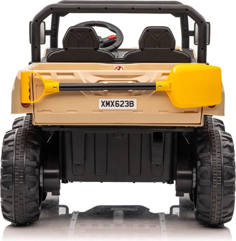 Robustné detské vozidlo Farmer Truck 24V 4x6 s elektrickou vyklápacou korbou prináša realistický zážitok z jazdy aj práce na „stavbe“. Ponúka 4 výkonné motory 75 W, mäkké EVA kolesá pre pohodlie, dvojité sedadlo z eko kože, plynulý rozjazd, predné osvetlenie a rodičovský diaľkový ovládač 2,4 GHz pre bezpečné riadenie. Ideálne na prevoz hračiek či lístia vďaka elektrickému kipru a priloženej lopatke.