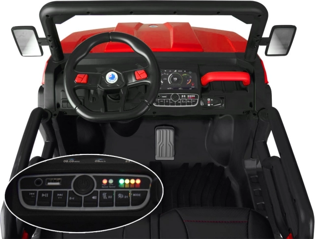 Malý vodič ocení realistickú palubnú dosku s voličom smeru (D/P/R), zvuk naštartovaného motora, USB vstup a prehrávanie melódií. Rodičia majú všetko pod kontrolou vďaka ovládaču 2,4 GHz (riadenie vpred/vzad, vľavo/vpravo, voľba rýchlosti a núdzové zastavenie). Otváracie dvere s poistkou uľahčia nastupovanie a bezpečnosť zvyšujú pásy.