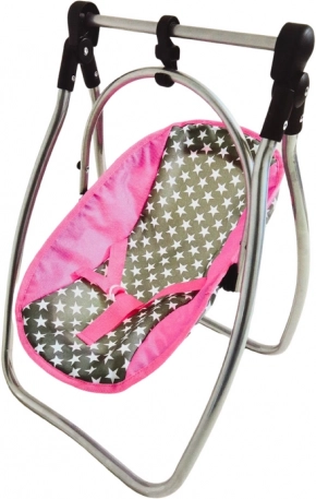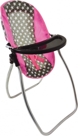 Tento praktický set kombinuje dve obľúbené hračky do jednej: počas chvíľky premeníte hojdačku na jedálenskú stoličku vďaka odnímateľnému hornému oblúku a priloženému stolíku. Pevný kovový rám, plastové spojky a kvalitný textilný poťah so vzorom hviezdičiek zabezpečujú bezpečie a pohodlie pre bábiku.