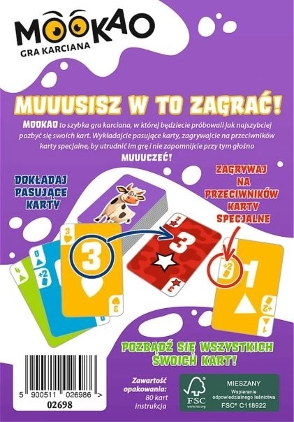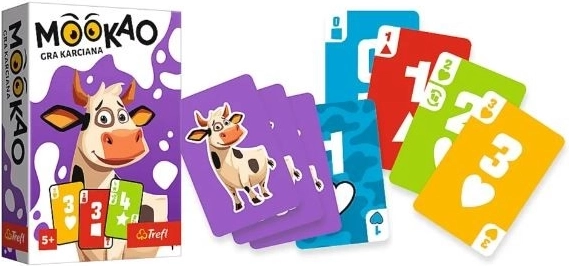Zábavná a dynamická kartová hra MooKao od Trefl, v ktorej je cieľom čo najrýchlejšie odhodiť všetky karty z ruky. Hrajte zodpovedajúce karty, používajte špeciálne efekty proti súperom a nezabudnite pritom poriadne zamúúúčať – smiech a napätie zaručené!