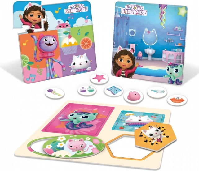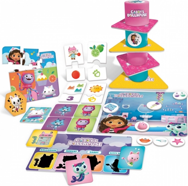 Tematické dosky a ilustrácie z Gabininkinho čarovného domčeka motivujú deti objavovať čísla, predmety a jednoduché pravidlá pri hre.