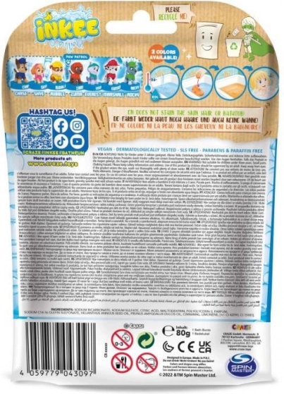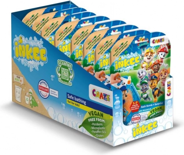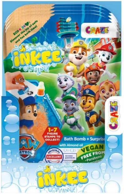 Šumivá bomba do kúpeľa Inkee s licenciou Paw Patrol prináša do vane farebnú podívanú a sladkú vôňu Cola Gummies. Vo vnútri sa skrýva prekvapenie, ktoré deti nadchne – pečiatka s jedným z obľúbených hrdinov. Každá guľa má hmotnosť 80 g a je zabalená v ekologickom obale.