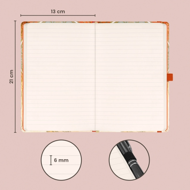 Elegantný linajkovaný notes s motívom Alfonsa Muchu – Maliarstvo v pevných doskách ponúka praktické uzatváranie na gumičku, pútko na ceruzku a vnútorné vrecko. Vo vnútri je 172 strán na príjemnom žltom papieri, ideálne pre poznámky, denník aj pracovné myšlienky.