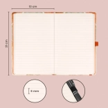 - Praktické prvky: elastická gumička, pútko na ceruzku, vnútorné vrecko