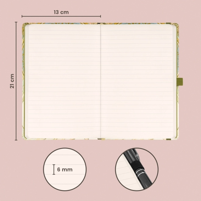 Vnútorné vrecko pojme drobnosti, vizitky či samolepky. Žltý papier s bodkovanou štruktúrou ponúka univerzálne využitie – od poznámok cez skicovanie až po bullet journal. Linajkovanie poskytuje prehľadnosť a pohodlné písanie doma, v kancelárii aj na cestách.