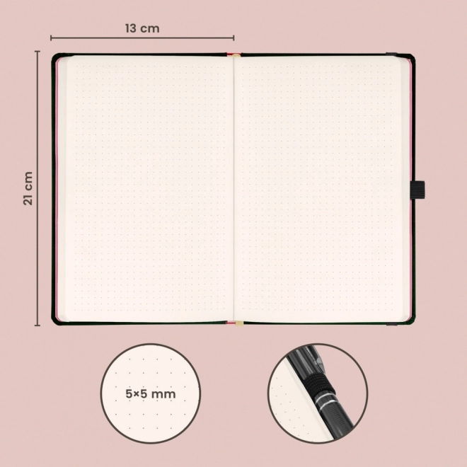 Bodkované stránky poskytujú voľnosť na presné plánovanie, kreslenie aj tvorbu prehľadných poznámok. Uzatváranie na gumičku udrží všetko pokope, zadné vrecko schová drobnosti a pútko zabezpečí, že budete mať ceruzku vždy po ruke.