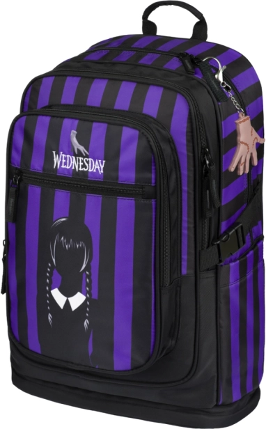 Štýlový školský batoh rady CUBIC inšpirovaný motívom WEDNESDAY ponúka ergonomicky tvarovaný chrbát, nízku hmotnosť 1,2 kg a objem 29 l. Tri komory s organizérom a vreckom na 15" notebook, reflexné prvky pre bezpečnosť a odolný vodoodolný materiál z neho robia ideálnu voľbu do školy aj na voľný čas.