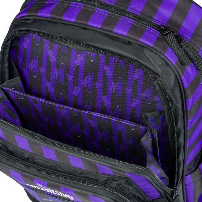 - Čierno‑fialové pruhy, motív WEDNESDAY