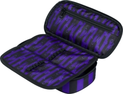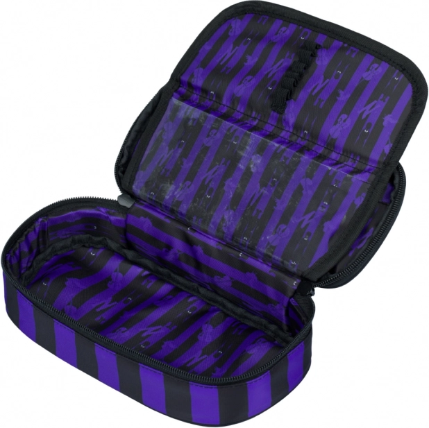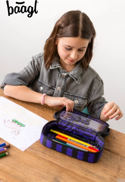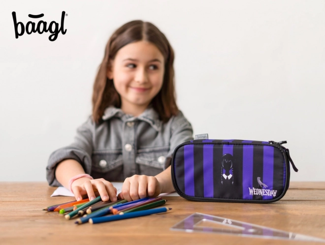 Štýlové školské puzdro BAAGL s motívom WEDNESDAY v čierno‑fialových pruhoch ponúka pevnú konštrukciu, prehľadné vnútorné usporiadanie s výklopnou prepážkou a praktické vrecko na zips. Ideálne do školy aj na cesty, bez náplne – pripravené na personalizáciu podľa vašich potrieb.