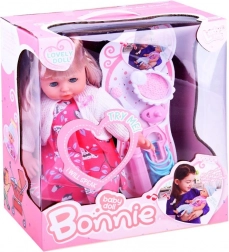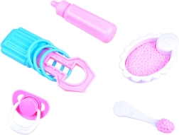 Súčasťou sady sú praktické doplnky: miska s kašou, lyžička, cumlík, fľaštička a hrkálka. Deti môžu kŕmiť, utišovať aj usínať svoje bábätko.