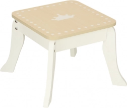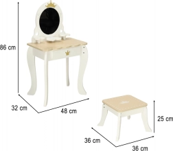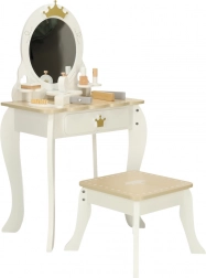 Súčasťou balenia je aj stolička, aby bolo možné pohodlne sedieť. Výrobok je kompletne zhotovený z hladko brúseného dreva, potiahnutého netoxickými farbami, v elegantnom bielo-zlatom dizajne, ktorý očarí ako ozdoba detskej izby.