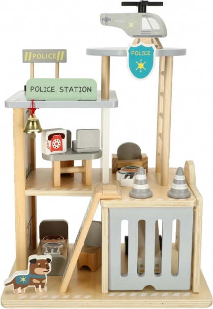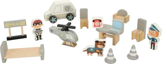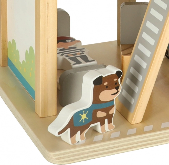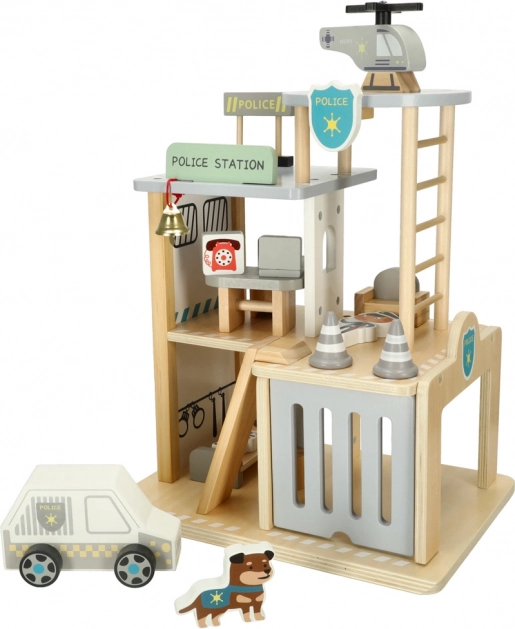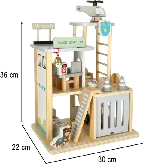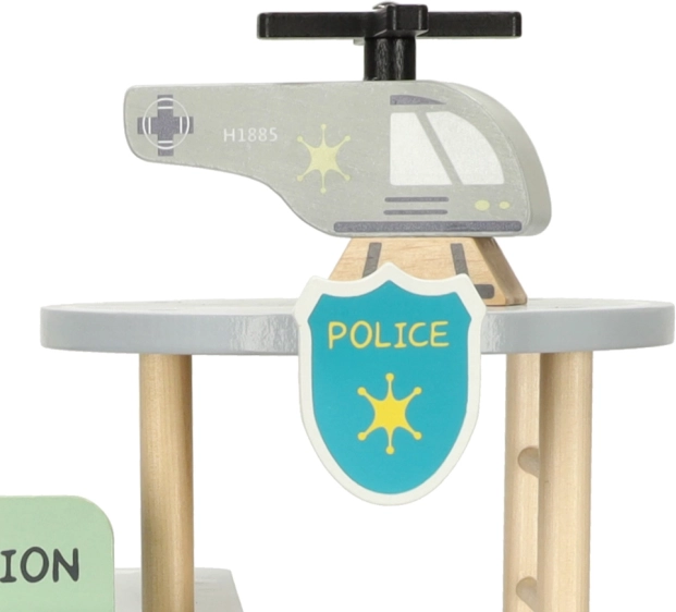 Tento premyslený drevený set prenesie deti do sveta záchranných akcií. Na prízemí je garáž pre policajné auto a cela pre zlodeja, uprostred kancelária veliteľa a na streche heliport pre rýchle výjazdy. Hladko opracované drevo zaisťuje bezpečnú manipuláciu a dlhú životnosť hračky.