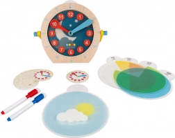 Súčasťou balenia je sada 14 stierateľných kariet a 2 farebných fixiek, vďaka ktorým si deti môžu zapisovať a opakovane precvičovať rôzne časové situácie – od ranného vstávania až po večerné ukladanie. Odolné drevené prevedenie zaisťuje dlhú životnosť a bezpečné používanie.