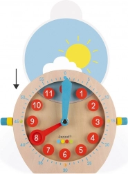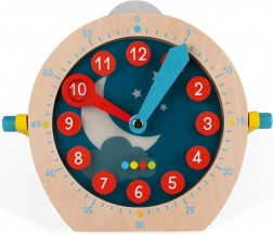 Drevené výučbové hodiny JANOD pomáhajú deťom rýchlo a s radosťou pochopiť, koľko je hodín. Veľký ciferník s jasne čitateľnými číslami a farebnými ručičkami vedie deti krok za krokom k porozumeniu času, či už trénujú celé hodiny, polhodiny alebo minúty.