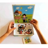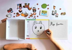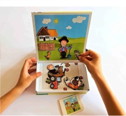 Táto šikovná sada spája písanie, mazanie a skladanie magnetických obrázkov do jednej kompaktnej hry. Deti môžu trénovať písmená a číslice, maľovať stierateľnou fixkou a vytvárať vlastné scénky z farmy. Vďaka magnetom jednotlivé dieliky dobre držia na podkladovej doske, čo z nej robí ideálnu zábavu do auta aj na doma.