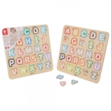 Zábavná a zároveň vzdelávacia hra pre najmenších: farebná drevená vkladačka s abecedou rozvíja jemnú motoriku, logiku aj poznávanie písmen. Pod každým písmenom sa skrýva obrázok v angličtine, takže deti prirodzene získavajú základy angličtiny už od útleho veku.