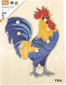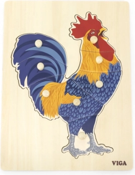 Táto drevená skladačka s kohútom je navrhnutá pre prvé logické hry a zmyslové objavovanie. Deti skladajú obrázok nielen podľa ilustrácie, ale aj podľa tvaru jednotlivých dielikov, čo posilňuje priestorové vnímanie a sústredenie. Gombíkové úchyty na každom dieliku uľahčujú uchopenie aj tým najmenším prstíkom.