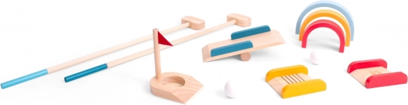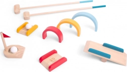 Zábavná rodinná hra pre 1–4 hráčov: drevený minigolfový set s prekážkami, ktorý rozvíja koordináciu oko–ruka, sústredenie a vytrvalosť. Ideálny na záhradu aj do parku, obsahuje 2 golfové palice, 2 loptičky a 7 farebných prekážok pre nekonečnú porciu pohybu a zábavy bez obrazoviek.