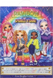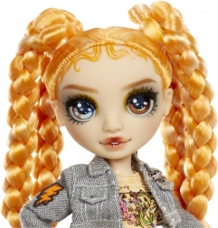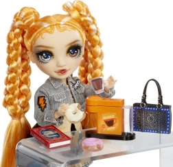 Bábika RAINBOW HIGH Sparkle & Shine Clementine prináša výrazný oranžový look, denimovú bundičku, sukňu s károvaným vzorom a platformové topánky s nápisom RAINBOW. Súčasťou je stojanček, hrebeň a tematické doplnky s motívom kávy, ktoré rozširujú herné možnosti a príbehy.