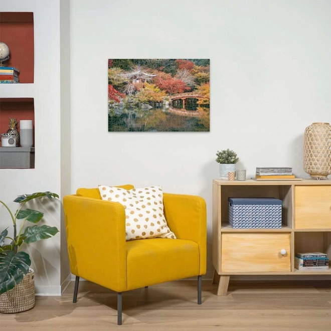 Jesenná paleta červených a oranžových tónov s tradičným mostom a chrámom vytvára motív, ktorý sa skladá s radosťou a pôsobí relaxačne.
