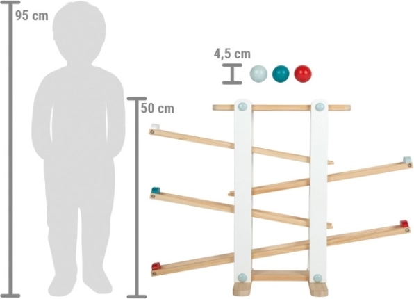 Užite si hodiny zábavy s veľkou drevenou guľôčkovou dráhou, ktorá ponúka 4 rýchle rampy, 3 extra veľké guľôčky (Ø 4,5 cm), hasičské autíčko a otočné guľôčkové koleso. Robustná konštrukcia z kvalitného masívneho dreva a moderný dizajn s farebnými detailmi podporujú rozvoj motoriky a koordináciu oko–ruka.