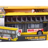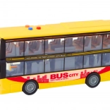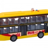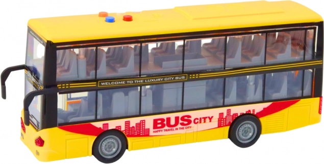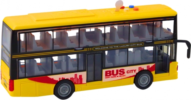 Autobus v ikonickej žltej farbe verne napodobňuje skutočný turistický doubledecker. Deti môžu spúšťať klaksón, zvuk motora a sledovať blikajúce svetlá, čo zvyšuje realistickosť hry. Zotrvačníkový pohon zaručí plynulú jazdu – stačí ľahko postrčiť a autobus sa rozbehne.