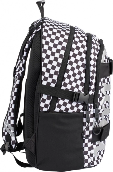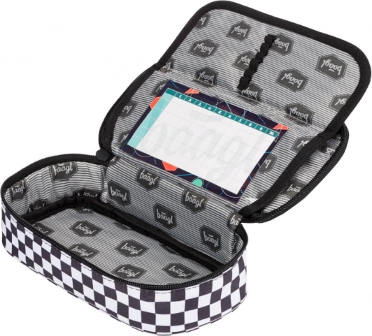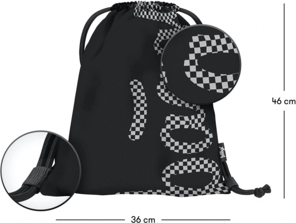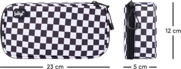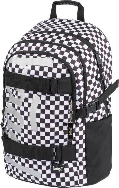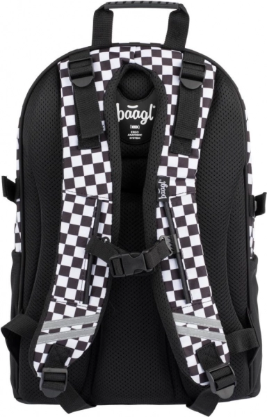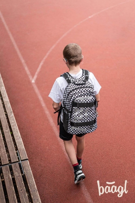Štýlový školský set BAAGL s čierno-bielym kockovaným motívom obsahuje priestranný batoh, praktický peračník a ľahké vrecko. Batoh ponúka ergonomicky tvarovaný chrbát, 3 komory s organizérom, vrecko na 15'' notebook a popruhy na skateboard. Vďaka reflexným prvkom, vodoodolnému materiálu a hmotnosti len 850 g je ideálny pre školákov aj na krúžky.