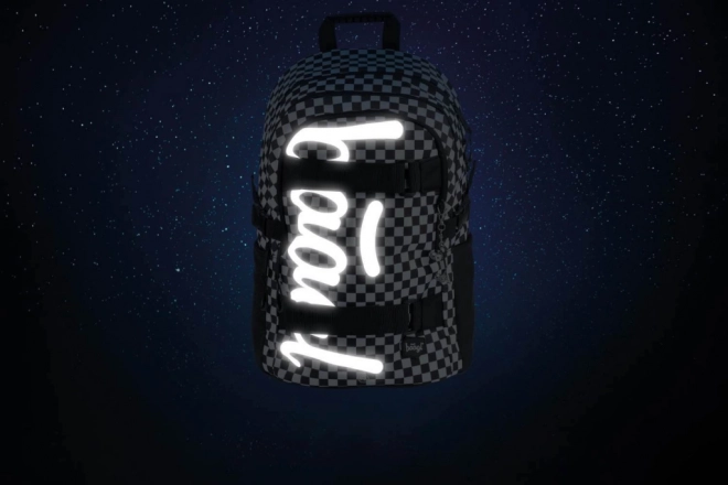 Na prednej komore sú praktické popruhy na uchytenie skateboardu. Batoh je z pevného, vodoodolného materiálu, doplnený reflexnými prvkami pre bezpečnosť a štýlovým kovovým príveskom v tvare skatu.