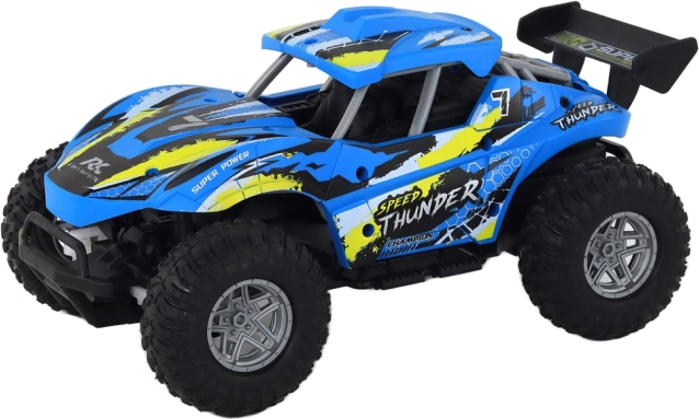 Toto zďaleka nielen detské terénne auto je stvorené pre zábavu na záhrade aj doma. Veľké, hlboko dezénované kolesá poskytujú skvelú priľnavosť a zadný pohon dáva modelu dynamiku a svižné štarty. Športový modrý dizajn s výraznou grafikou zaujme na prvý pohľad.