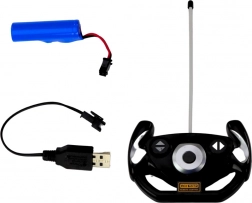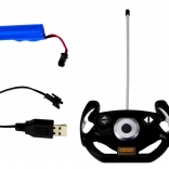 Diaľkové ovládanie v tvare volantu s tlačidlami a kovovou anténou pre lepšiu manévrovateľnosť hračky.
