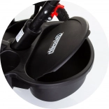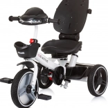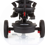 Bezpečnosť zabezpečujú päťbodové pásy s mäkkými ramennými polstrami, ochranné madlo, kryt predného kolesa proti zachyteniu nožičiek a nožné brzdy na zadných kolesách. Praktická výbava zahŕňa predný aj zadný košík, tašku na príslušenstvo na vodiacej tyči a riadidlá s hudbou a svetlom (2× AA, 1,5 V).