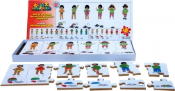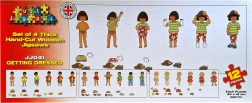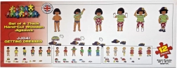 Drevený puzzle set od Just Jigsaws predstavuje štyri postavy, ktoré deti postupne obliekajú, čím zábavnou formou precvičujú logické myslenie a názvy jednotlivých kusov odevov.