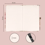 Elegantný zápisník NOTIQUE s motívom púdrových kvetov v praktickom formáte 13 × 21 cm ponúka 172 bodkovaných strán na žltom papieri, pevné dosky, uzatváranie na gumičku, pútko na pero a vnútorné vrecko – ideálny na denník, poznámky aj plánovanie.
