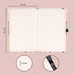 Vo vnútri nájdete 172 bodkovaných strán zo žltého papiera, ktoré sú príjemné pre oči a vhodné na písanie aj ľahké skicovanie. Linajkový formát vám pomôže udržať text prehľadný a usporiadaný.