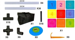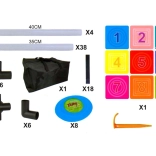 - Terč s poľami, 8 diskov, taška, trubky 40 cm × 4, trubky 35 cm × 38, spojky × 28, suché pásky × 18, plastové kolíky × 6