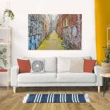 Ulička s graffiti a bicyklami vytvára pestrý a dynamický obraz, ktorý zaujme na prvý pohľad a po zložení skvele ozdobí interiér.