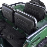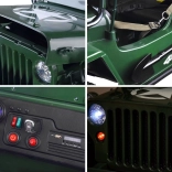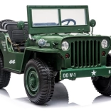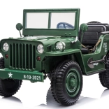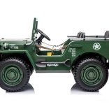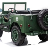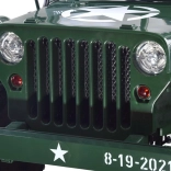 Vojenské terénne auto pre 3 osoby je pre všetky deti, ktoré majú rady vojenskú tematiku. Vojenský džíp, silné, výkonné, veľké masívne vozidlo, ktoré iste zvládne vojenské úlohy. Ako sa na také vozidlo patrí, je vojenský terénny voz vybavený všetkým potrebným príslušenstvom a výzbrojou. Voz s pohonom všetkých štyroch kolies má možnosť dvojakého pohonu, takže je na vodičovi, aby sa rozhodol, kedy príslušný pohon použije. Voz je vybavený úložnými priestormi, kufrom a lopatou. Má zvukové efekty, svetelné efekty, sklopné čelné sklo, široké sedadlá. Vozidlo má možnosť ovládania diaľkovým ovládačom alebo samostatne vodičom.
