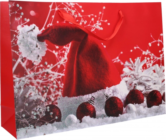 Táto priestranná vianočná darčeková taška z pevného papiera je skvelou voľbou na elegantné zabalenie darčekov. Vďaka rozšírenému dnu a bočným skladom ľahko pojme väčšie či objemnejšie predmety, zatiaľ čo pevné uši zaistia pohodlné a bezpečné prenášanie.