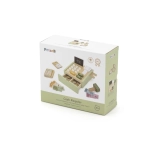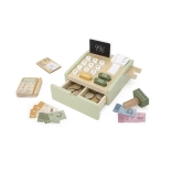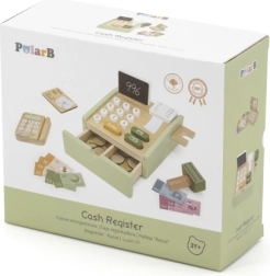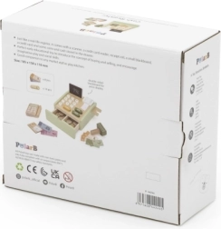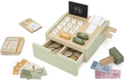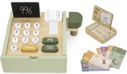 Drevená pokladňa v príjemnej zelenej farbe je skvelá vzdelávacia hračka pre deti od 3 rokov. Ponúka funkčné prvky ako vysúvací šuplík, tlačidlá, skener, terminál na kartu a rolku papiera, ktoré verne napodobňujú skutočnú kasu. Súčasťou je aj obojstranná mini tabuľka na zapisovanie účtov.