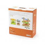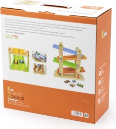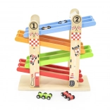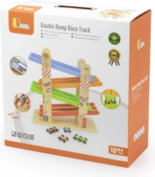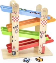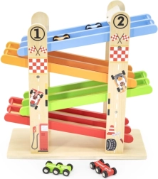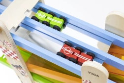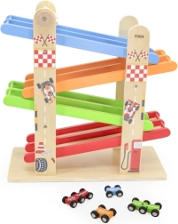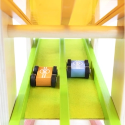 Táto robustná drevená dráha ponúka dvojitú rampu pre napínavé preteky dvoch autíčok súčasne. Deti zaujme pestré farebné prevedenie a zvončeky umiestnené v cieli, ktoré sa rozozvučia pri dojazde vozidielok. Konštrukcia je prispôsobená malým detským rukám – hladké hrany, stabilná základňa a odolné materiály zaručujú dlhú životnosť aj bezpečnú hru.