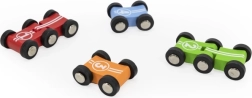 V balení nájdete štyri rôznofarebné autíčka so štartovnými číslami, a to v dvoch typoch – dve štvorkolesové a dve šesťkolesové – pre väčšiu rozmanitosť jazdy. Hra prirodzene rozvíja logické myslenie, jemnú motoriku, koordináciu oko–ruka, učenie farieb a čísel aj sociálne zručnosti pri súťažení (výhra/prehra).