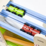 Lakované drevo, netoxické farby a hladké hrany. Súčasťou sú štyri farebné autíčka – dve štvorkolesové a dve šesťkolesové.