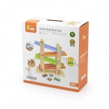 Zábavná drevená závodná dráha s dvojitým pruhom od Viga prináša deťom nekonečné preteky a radosť z pohybu. Dva paralelné pruhy umožnia usporiadať súboje dvoch autíčok naraz, na konci ich privítajú zvončeky v cieli. Odolné prevedenie z lakovaného dreva, bez ostrých hrán a s netoxickými farbami je bezpečné pre malé ruky. Súčasťou sú 4 farebné autíčka v dvoch prevedeniach (4-kolesové a 6-kolesové), ktoré podporujú motoriku, koordináciu oko–ruka a hravou formou zoznamujú s fyzikálnymi princípmi.