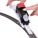 Koľaje majú kovové pásnice a plastové podvaly s jemným gravírovaním, ktoré verne imitujú drevo. Vďaka zasúvacím spojom drží trať pevne pokope a pri jazde sa nerozpojuje. Zostavený kruh má priemer cca 96 cm a dĺžka trate činí približne 250 cm – ideálne rozmery na domáce hranie a začiatky s modelovou železnicou.