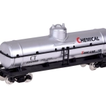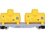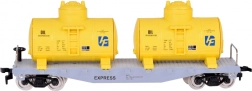 Plošinový vozeň s dvoma žltými cisternami a samostatná strieborná cisterna CHEMICAL. Otočné nápravy umožňujú hladké prechádzanie oblúkmi.