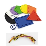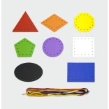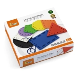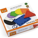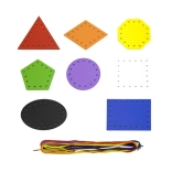 Osem farebných tvarov a osem šnúrok motivuje k triedeniu, párovaniu a pomenúvaniu. Deti sa učia farby aj geometrické tvary zábavnou formou.