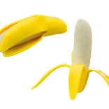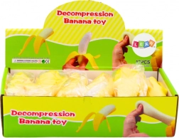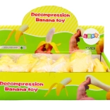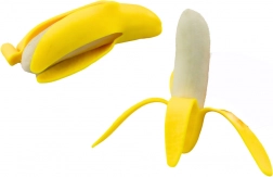 Žltá šupka, otvorená na konci, odhaľuje vnútornú svetlú dužinu banánu, ktorú možno stláčať, miesiť a naťahovať. Stláčací materiál je mimoriadne pružný a odolný, čo zaručuje, že sa hračka vráti do pôvodného tvaru aj po intenzívnom používaní.