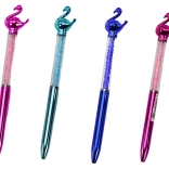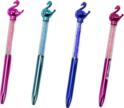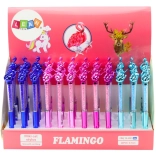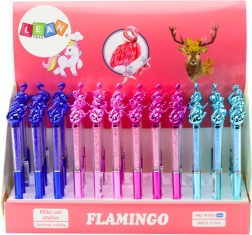 Štýlové guľôčkové pero s figúrkou plameniaka očarí na prvý pohľad. Priehľadné telo s drobnými kamienkami vytvára jemný lesk a dodáva písaniu nádych luxusu. Disponuje modrou náplňou 0,7 mm pre hladký a plynulý písomný prejav. Ideálne ako darček, do školy aj do kancelárie. K dispozícii je mix farieb.