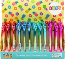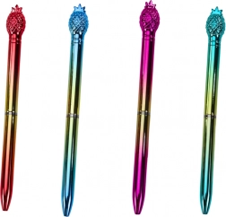 Štýlové guľôčkové pero so zlatým telom a dekoratívnym ananásom na konci spája eleganciu a funkčnosť. Píše modrým atramentom s plynulým tokom a šírkou hrotu 0,7 mm, ideálne na každodenné poznámky aj ako darček. Dostupné v zlatom prevedení s farebnými akcentmi: ružová, modrá, červená, zelená.