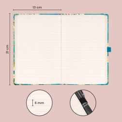Vďaka praktickým detailom budete mať všetko po ruke: elastická gumička drží zápisník bezpečne zatvorený, pútko na pero zaistí písacie potreby a vnútorné vrecko ukryje vizitky či voľné papieriky. Linajkované listy na príjemnom žltom papieri podporia prehľadné poznámky aj denné záznamy.